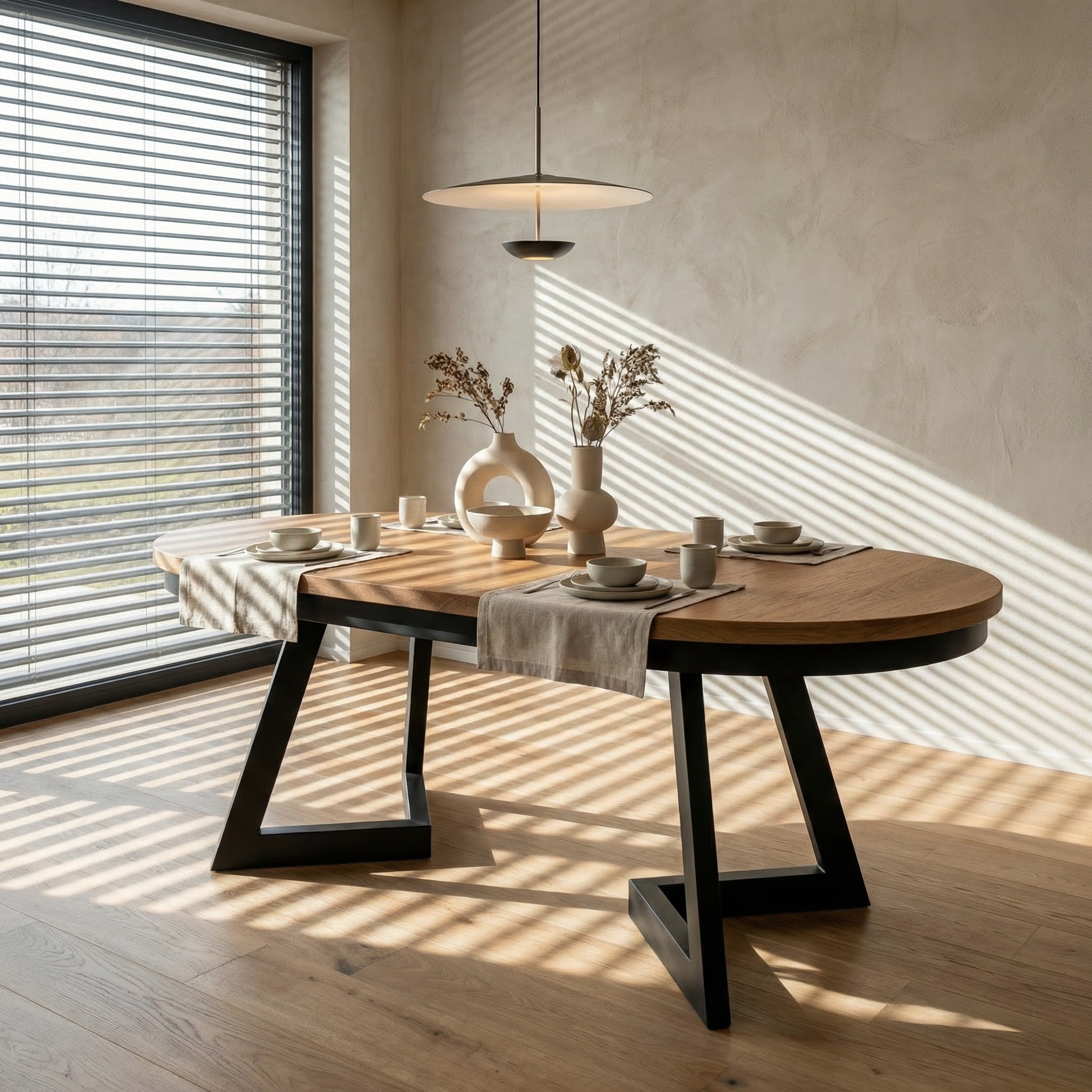 Owalny stół drewniany Vouhel wyróżnia się starannie dobranymi materiałami. Blat wykonano z wysokiej jakości drewna dębowego, które jest nie tylko trwałe, ale również łatwe w pielęgnacji. Naturalna struktura drewna wprowadza ciepło i przytulność, a zaokrąglone krawędzie blatu nadają całości subtelnej lekkości. Solidna metalowa podstawa, wykończona w industrialnym stylu, gwarantuje stabilność i dodaje całości designerskiego sznytu.